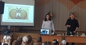 Молодые учёные Брундуков Алексей, Ковалёва Ярослава (БСЖ) и Цвирко Егор рассказали первоклассникам, кто такие учёные и чем они занимаются. Наглядно продемонстрировали, как выглядят предметы под микроскопом, что может 3D-принтер и с какими законами физики они сталкиваются каждый день.