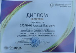 Три доклада из шести представленных сотрудниками института были отмечены дипломами и рекомендованы для опубликования в журнале «Механика машин, механизмов и материалов», который входит в перечни ВАК Беларуси и России. Сазанков А.П. принял участие в конкурсе молодых ученых с докладом «Сопоставление методов экстраполяции при определении предела выносливости в условиях циклического нагружения» и был отмечен диплом III степени.